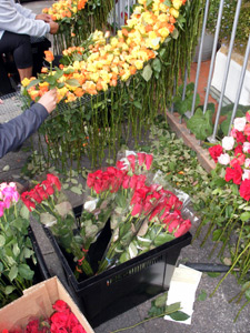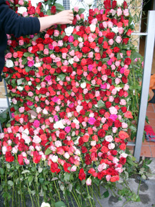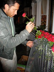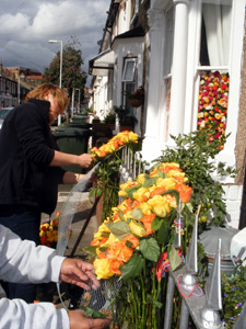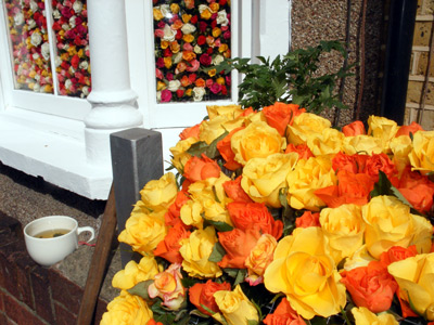 Boxes of cut roses from near-by Spitalfields Fruit and Flower Market were stacked outside Small World, which then became the construction site, over three days, for the installation of ‘Flower Power’. The artist worked constantly with a changing shift of residents who wanted ‘Flower Power’ windows for the project launch opening on 6 September 2008.