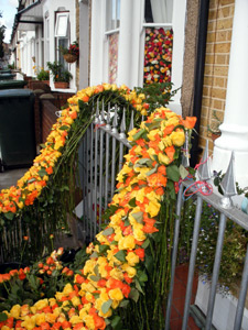Sadly the budget was limited so the demand outstripped the supply. Working late into the night the final window was filled in a house of a French resident. It was the French who first brought the planting of flowers to East London in the 17th Century and the artist’s name is also French. However it is the Asian community’s extensive use of flowers and petals (historically and presently) which has influenced this project and which was admired by many as ‘up lifting against the grey’ urban space.