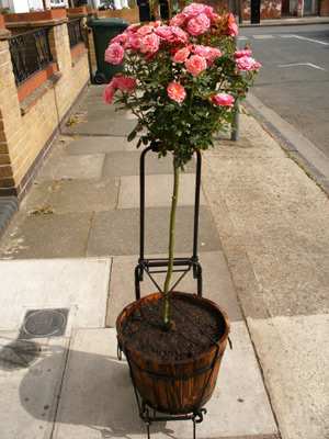 A resident stood outside his house on Faringford Road and simply watched as a Worland Road resident, Eamon, assisted Alison to cane up some flagging tomatoes belonging to the children’s garden in Vernon Road. One evening as she passed he said ‘It’s the flower lady’, as this had become her nick-name. Another resident who thanked a neighbour for a hanging basket became intrigued when the response was ‘it wasn’t me but I did see the back of a blond disappear around the corner’ – this was a regular occurrence. Seeing some dying plants in a container in Aldworth Road the artist knocked on the door and as there was no one in she took the container to Small World for replanting. As she turned the corner to Vernon Road she became aware she was being chased by a irate resident who was relieved to discover that she was being included in the reGeneration project. One evening the artist had installed 50 hanging baskets to existing hangers throughout Stratford Village. Other residents knocked on the door of Small World bringing their containers into the back of ‘the shop’ for planting. These were also delivered to elderly residents on the trolley – the artist manoeuvring the trolley up and down the Stratford Village streets became a regular sight and situation.